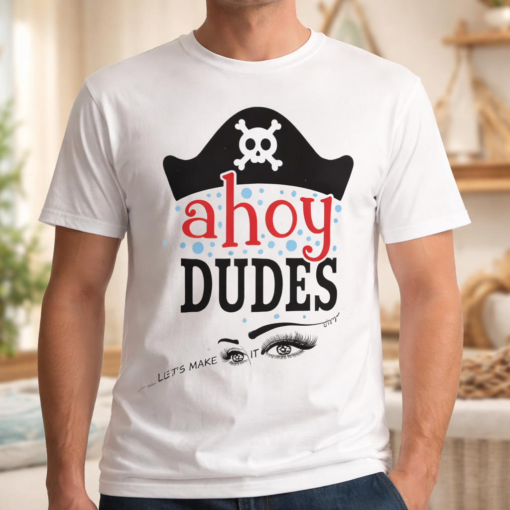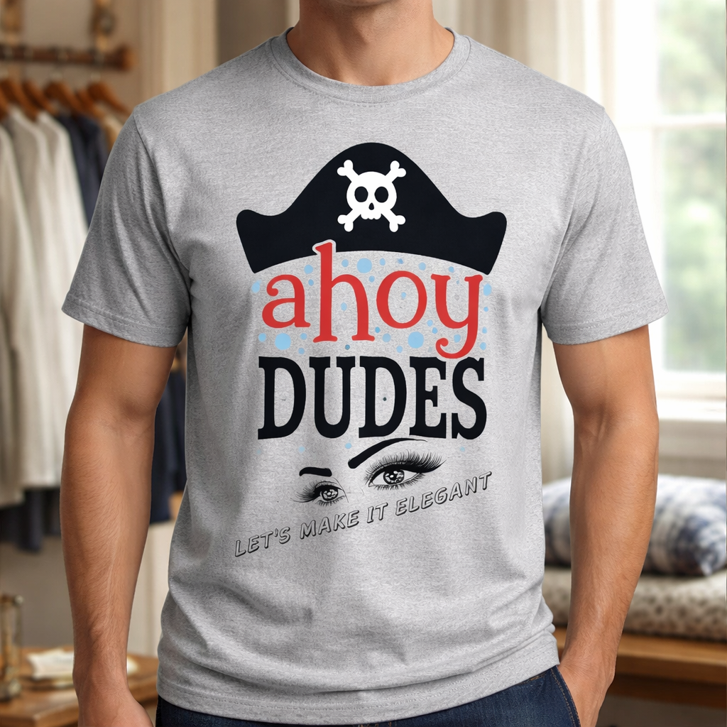 This eye-catching graphic tee features a fun pirate-inspired design with the phrase “Ahoy Dudes” front and center, topped with a classic skull-and-crossbones hat. It’s the perfect blend of humor and laid-back cool—ideal for anyone who loves to stand out without trying too hard.