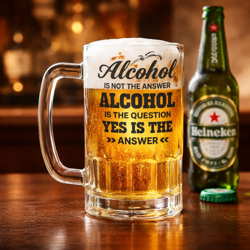 Bring the laughs to every sip with this bold and witty “Alcohol Is the Question” Beer Mug 🍺😄