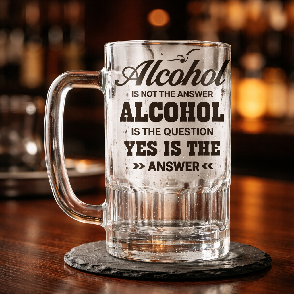 Featuring the humorous phrase “Alcohol is not the answer… Alcohol is the question. Yes is the answer,” this eye-catching glass is perfect for those who enjoy a good joke with their drink. The mix of script and bold typography creates a fun, standout design that’s sure to spark conversations.