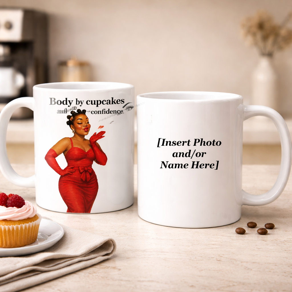 This fun and empowering ceramic mug features a vibrant, vintage-inspired illustration paired with the playful statement: “Body by cupcakes and confidence.” It’s a delicious mix of humor, self-love, and bold personality—perfect for those who embrace life (and dessert) unapologetically.