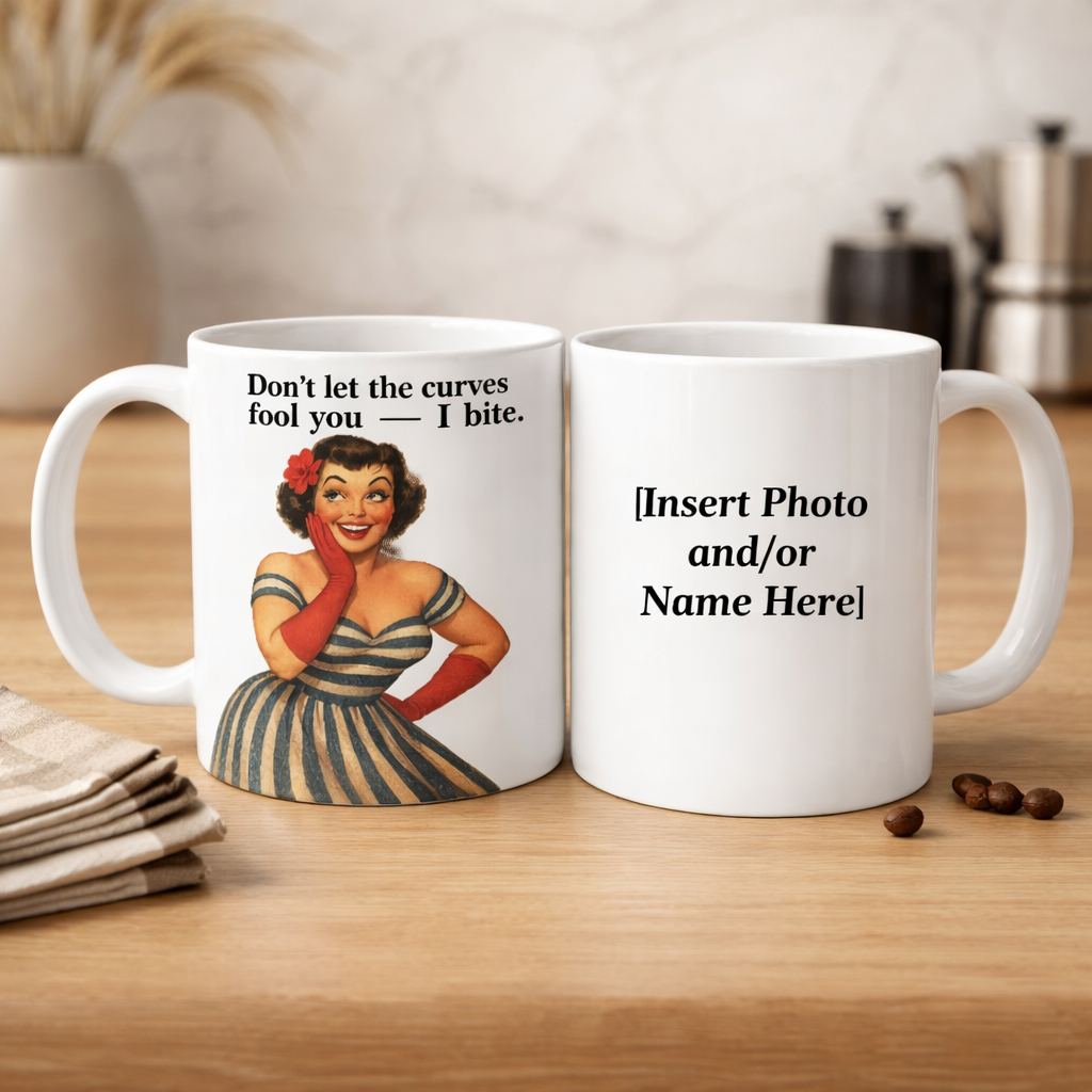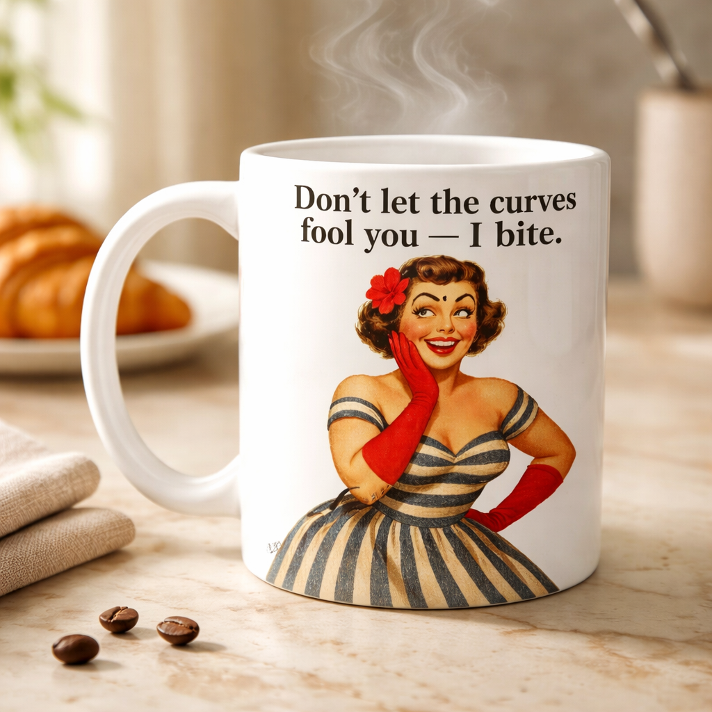 This bold ceramic mug features a playful, vintage-inspired illustration paired with the cheeky statement: “Don’t let the curves fool you — I bite.” It’s the perfect mix of charm and sass, made for those who embrace their confidence with a little edge.
