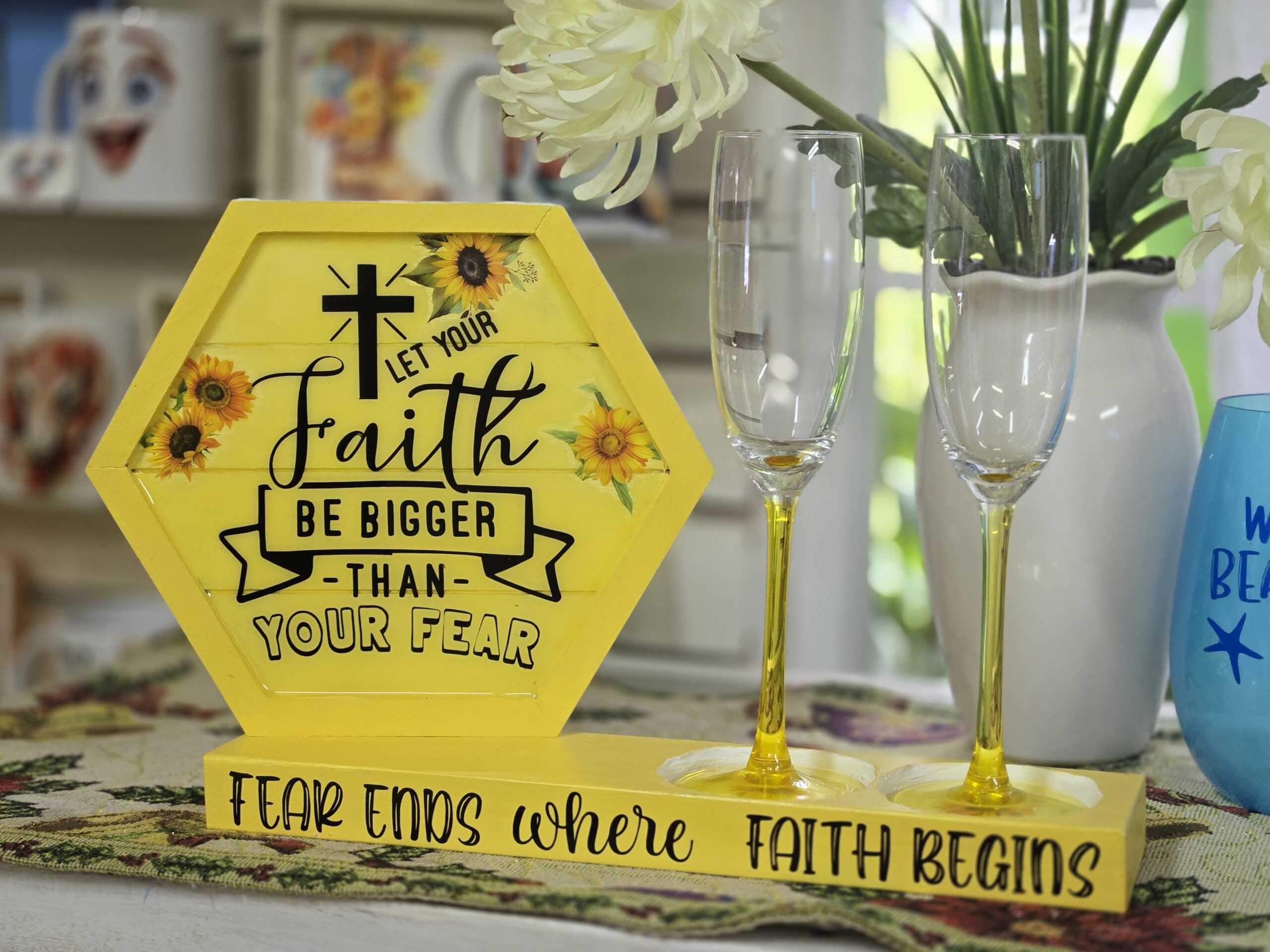 Spruce up any room in your office or home with Faith is Bigger Mug Mate with Wine Glasses! Printed exactly the way you want, these wooden desktop block make a great accent pieces and conversation starters for your guests. Add your own funny, sarcastic, or sentimental messages and pictures to create the perfect gift your loved ones will cherish for a lifetime.