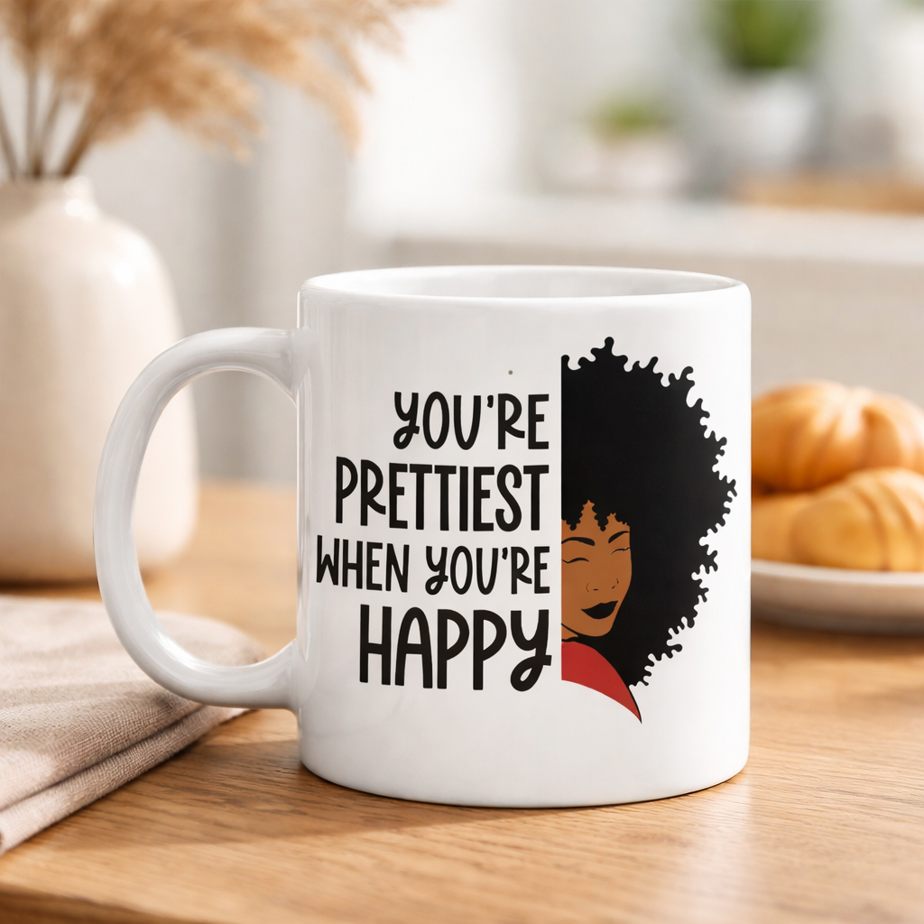 Start your day with a reminder of confidence and joy with the “Happy Glow” Inspirational Ceramic Mug. Featuring the empowering message “You’re prettiest when you’re happy,” alongside a bold, artistic illustration, this mug is designed to uplift your spirit with every sip.