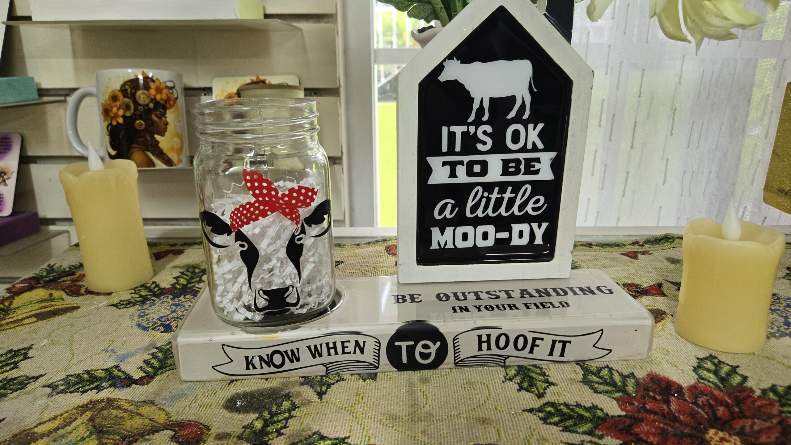 Place this charming Little Moody Mug Mate with Mason Jar on a shelf in your home or office and bring a little bit of that vintage farmhouse vibe to your decor. Use the customize options to create a truly one of a kind for yourself by changing fonts and the background color.