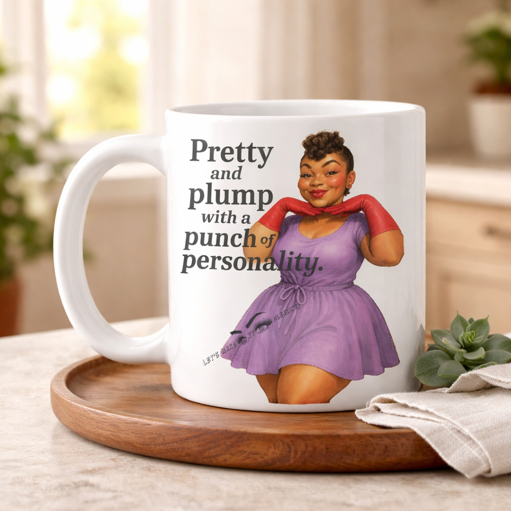 This delightful ceramic mug showcases a vibrant, vintage-inspired illustration paired with the playful and empowering quote: “Pretty and plump with a punch of personality.” It’s a celebration of beauty, confidence, and individuality—perfect for anyone who embraces their uniqueness with style.