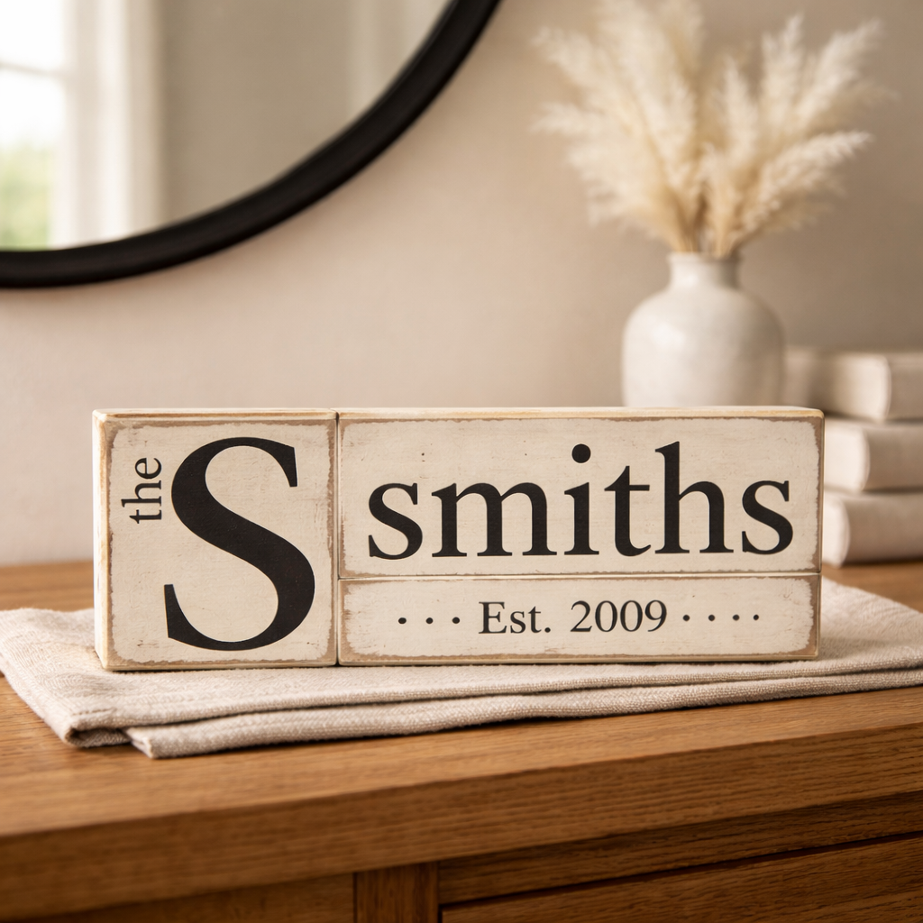Add a warm, personal touch to your home with this charming rustic family name block sign. Featuring the custom design “The Smiths – Est. 2009,” this piece beautifully celebrates family roots, love, and the year your story began.