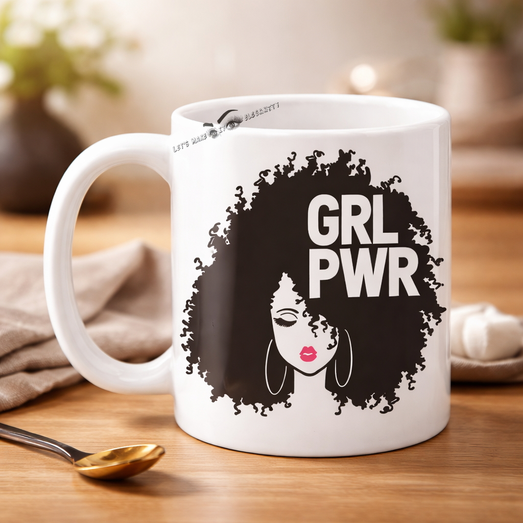 This statement mug features a striking afro-inspired graphic paired with the bold “GRL” text—celebrating confidence, culture, and unapologetic self-expression. Designed to stand out, it’s the perfect blend of modern edge and empowering energy for your daily coffee or tea ritual.