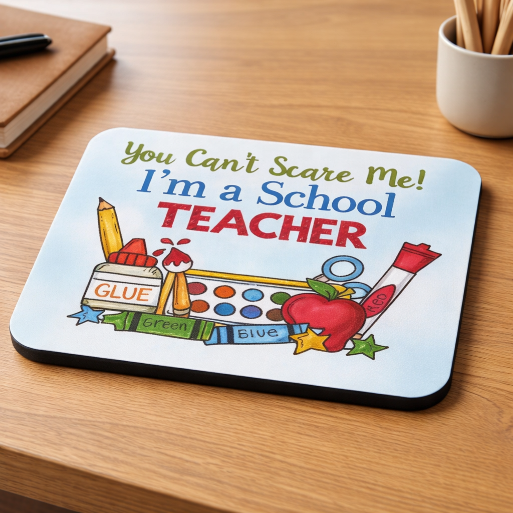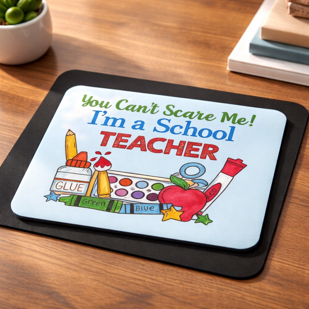Bring personality and humor to your workspace with the “You Can’t Scare Me – Teacher Strong” Desk Mat. Designed especially for educators, this vibrant mat features the playful message “You Can’t Scare Me! I’m a School Teacher” alongside colorful classroom-themed illustrations like pencils, glue, paint, and an apple.